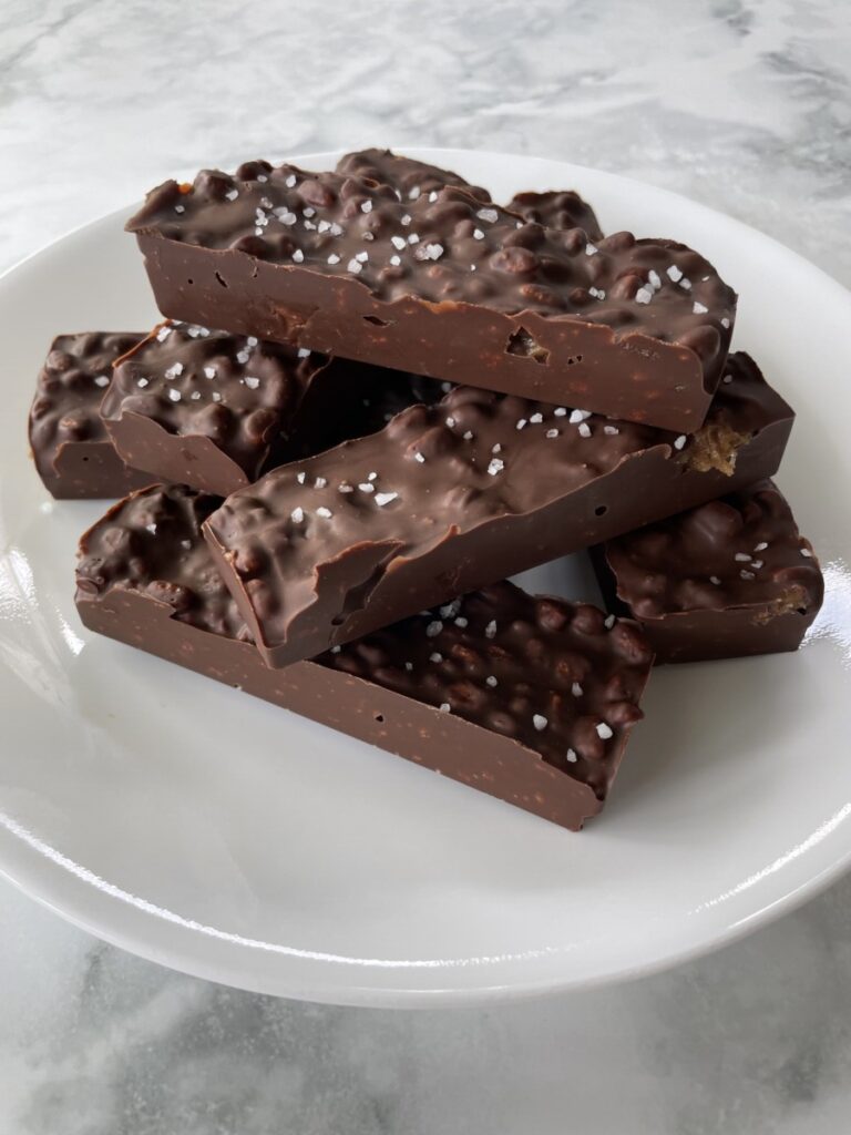 • Set the bars in the freezer for about 15 minutes or so until solidified. Top with sea salt, and enjoy! These bars can be stored covered in the fridge.