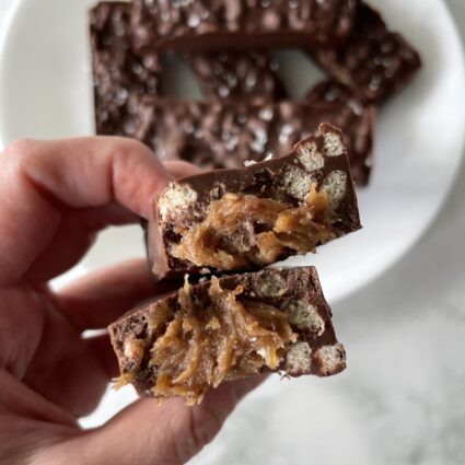 You’ll never want to buy store-bought candy bars again after making these crispy vegan peanut butter caramel bars!