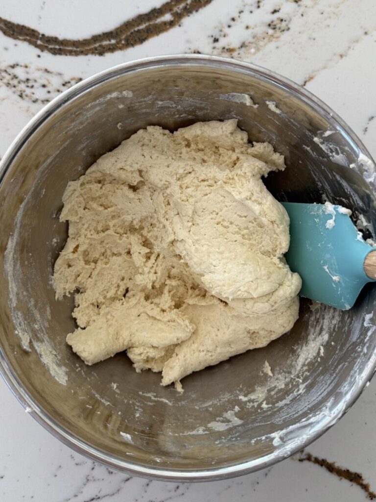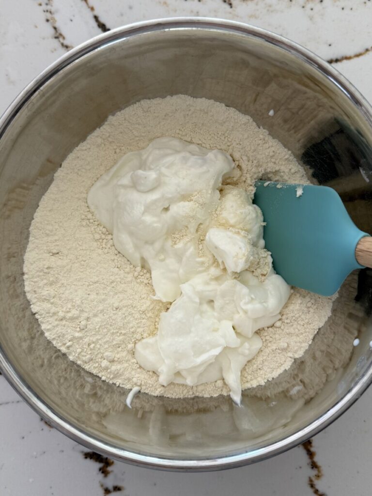 - Grab a medium bowl and add all of your dry dough ingredients (einkorn flour, baking powder and salt). Mix well. Then add in the Greek yogurt and mix well with a spatula or your hands until a soft dough forms. (The consistency of the dough should be soft and a tiny bit sticky. You should be able to easily mix it with a spatula and knead it with your hands. You want to add more flour ONLY if it’s so sticky that it’s sticking to your fingers and you can’t roll it with your hands. Only add 1 or 2 extra tbsp of flour and not any more or it will affect the texture of the monkey bread).