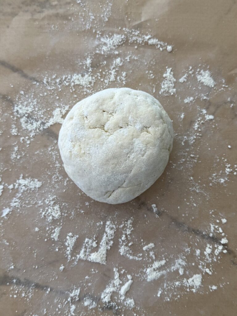 - Next, grab a sheet of parchment paper and sprinkle a little einkorn flour evenly on the parchment paper. With your hands, form the dough into a big ball and place it on the parchment paper. Roll the dough in the flour until the surface of the dough ball is lightly coated in a little bit of flour. This is just so it’s easier to handle and slice.