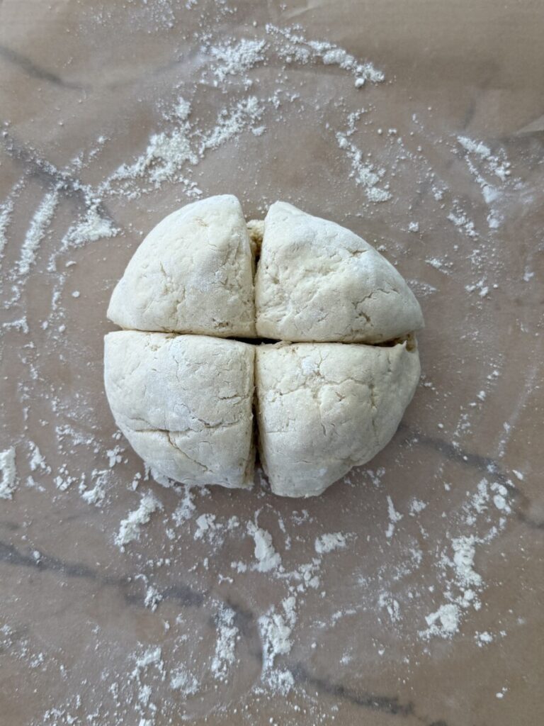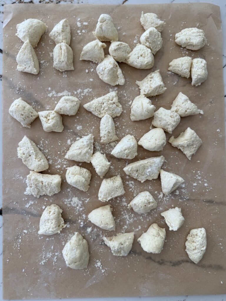 - Slice the dough ball into four even pieces. Then slice those four pieces to make eight pieces. Then take those eight pieces and slice them into bite-size pieces. Please see the photos above for reference! Add the pieces of dough to a medium bowl and set aside.