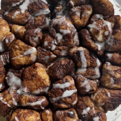 - While the monkey bread is in the oven, make your icing. Mix your powdered sugar and almond milk (or milk of choice) in a small bowl and whisk well. Pour the icing over the monkey bread after it has cooled for about ten minutes and eat while it’s warm. Enjoy!