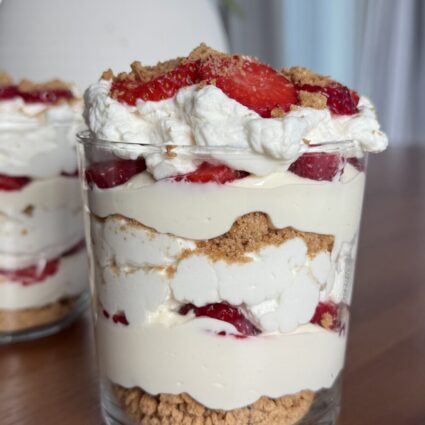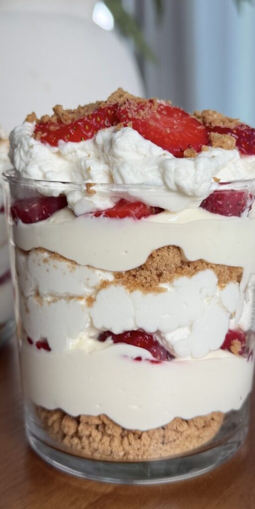 Next, you’ll assemble the parfaits into two small glasses or jars. You can add the layers however you want to! Measure the strawberries and graham crackers with your heart. Note that you may have extra whipped cream which I like to store in the fridge and enjoy with berries the next day!