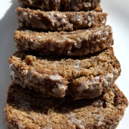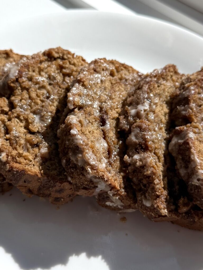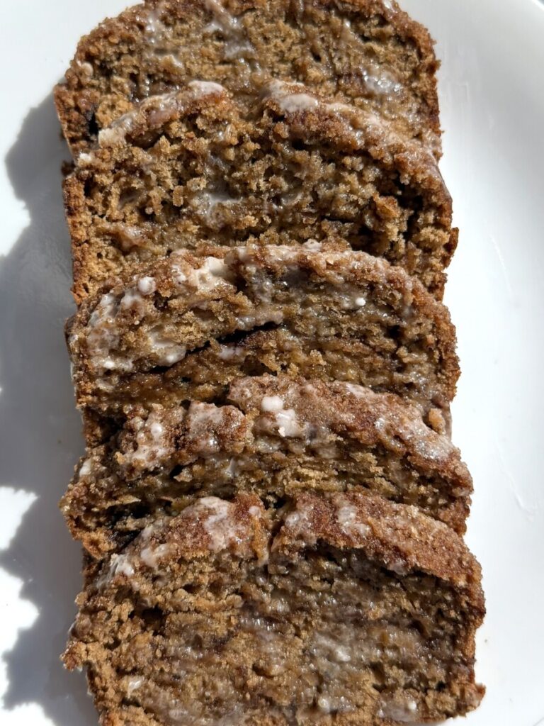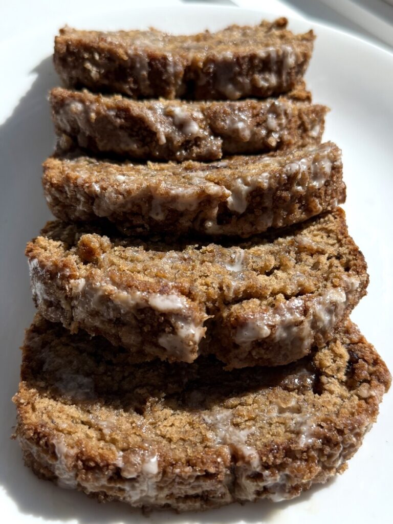 Once the banana bread is cool, mix up your powdered sugar and milk icing, drizzle on top, slice and enjoy!